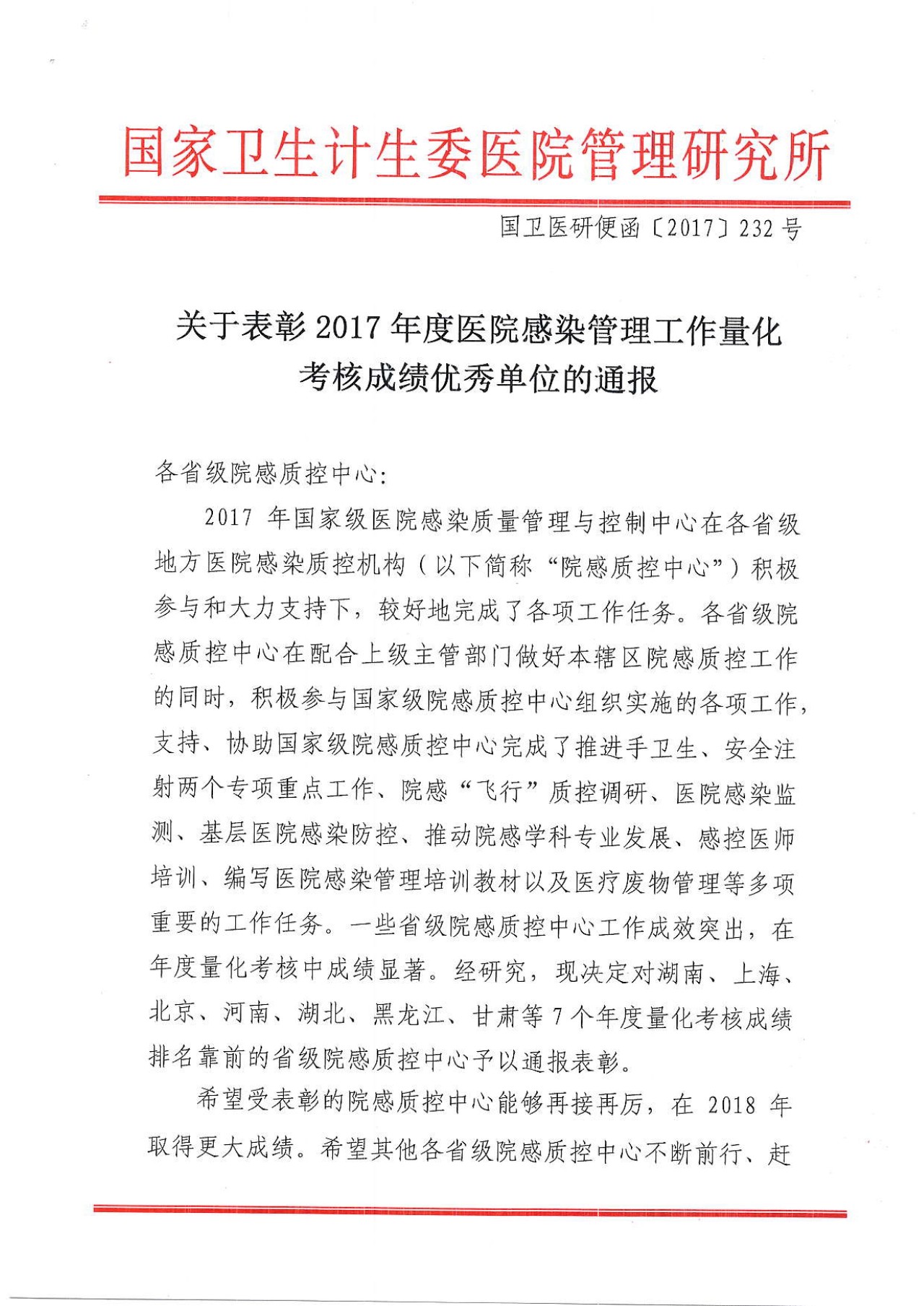 国家医院感染质控中心对各省市质控中心2017年工作进行了量化考核,湖南、上海、北京、河南、湖北、黑龙江、甘肃被评为2017年度优秀质控中心。