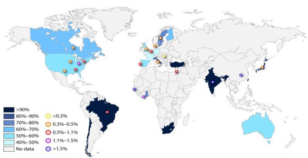 当艾滋病、禽流感、SARS逐渐被人熟知的时候,人巨细胞病毒似乎还非常陌生。人巨细胞病毒(human cytomegalovirus,HCMV,简称为CMV),是一种在广泛存在的病毒,不出意外的话,看这篇文章的你,我,他,都是CMV携带者。我国在2016曾对北京无偿献血者的CMV-IgG抗体筛查发现阳性率随着年龄逐渐增加,18-25岁阳性率为86.49%,26-30岁为91.32%,31-35岁为94.4%。从全球来说(图1),社会经济水平差的国家CMV感染率更高,巴西、南美、印度等国家育龄期妇女CMV-IgG阳性率均在90%以上,欧洲和北美相对较低,60%左右。我国只有个别地区数据,因此地图上没有标记,但从北京近90%的数据推测全国的感染率可能更高,如果标记上去,世界地图上将会增加一大片深色。