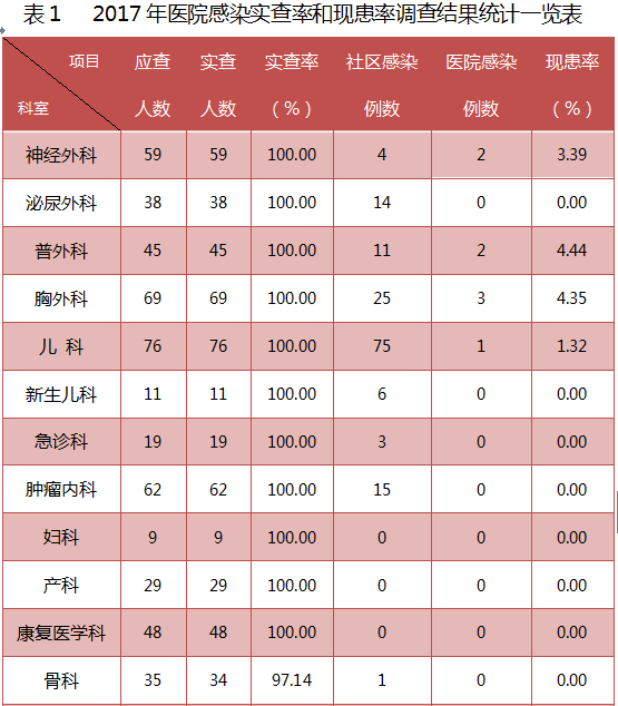 根据《医院感染管理办法》、《医院感染监测规范》以及省、市医院感染质量控制中心的要求,2017年11月15日对所有住院患者进行现患率调查。我院严格按照质控中心要求于11月15日0时-24时对20个临床科室进行现患率调查,现将总结与分析如下。