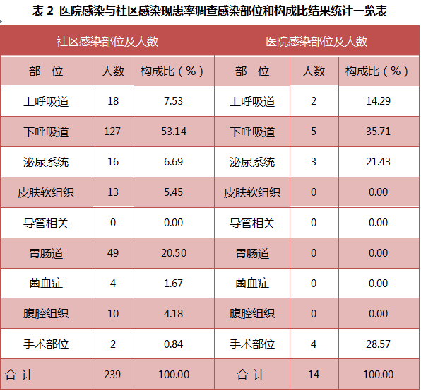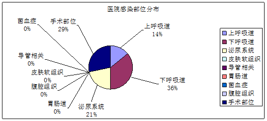 2017年医院感染现患率发生部位由高到低分别为下呼吸道5例、手术部位感染4例、泌尿道3例、上呼吸道2例。社区感染部位由高到低分别为下呼吸道127例、胃肠道49例、上呼吸道18例、泌尿系统16例皮肤软组织13例、腹腔组织10例、菌血症4例以及手术部位2例等。
