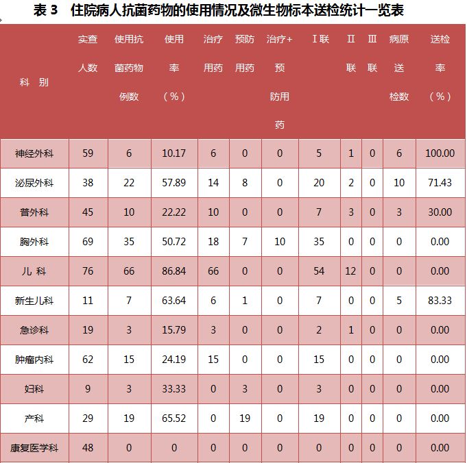 3.3 治疗用药病原微生物送检率较低,为18.02%,存在经验用药,沒有结合临床开展必要的病原学检查及药敏试验选用抗菌药,存在不合理使用抗菌药物隐患。