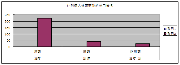 实查人数773例,抗菌药物使用人数287例,抗菌药物使用率为37.13%,其中治疗用药222例,使用率为77.35%;预防用药40例,使用率为13.94%;治疗+预防用药25例,使用率为8.71%。其中一联使用率为93.65%,二联使用率为6.35%,三联使用率为0.00%。治疗用药病原微生物送检43例,送检率13.94%。