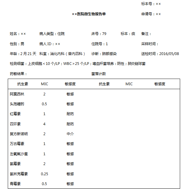 当前,细菌耐药是临床治疗和医院管理面临的一个重大问题。随着国家对抗菌药物合理使用整治工作的深入和临床诊疗的复杂性和挑战性,临床对微生物学检验结果的依赖程度也越来越高,微生物学检验结果对临床诊断和治疗提供参考依据,那么正确解读微生物学检验报告单中各项的含义,对合理选用抗菌药物有着重要的指导意义,本文就以某医院的一份肺炎链球菌的报告单为例来加以说明。